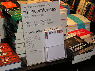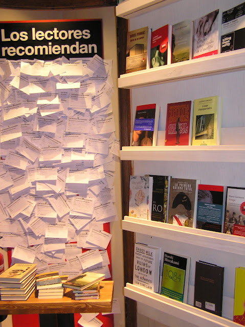 Son las seis de la tarde, está anocheciendo, tomo un café muy rico mientas leo….De fondo suena China Town, de The be good Tanyas (descubro este grupo aquí, me encanta, me tengo que hacer con este disco……)En una de las mesas hay un cartel que llama mi atención: Tu recomiendas.En los libros que hay en esa mesa la gente ha dejado dentro una cartulina con su recomendación. Totalmente personalizado. ¡Qué idea tan buena¡ ¡un lector te recomienda un libro que ha leído¡De verdad…hay lugares que son buenos para el espíritu. Este es uno de ellos.