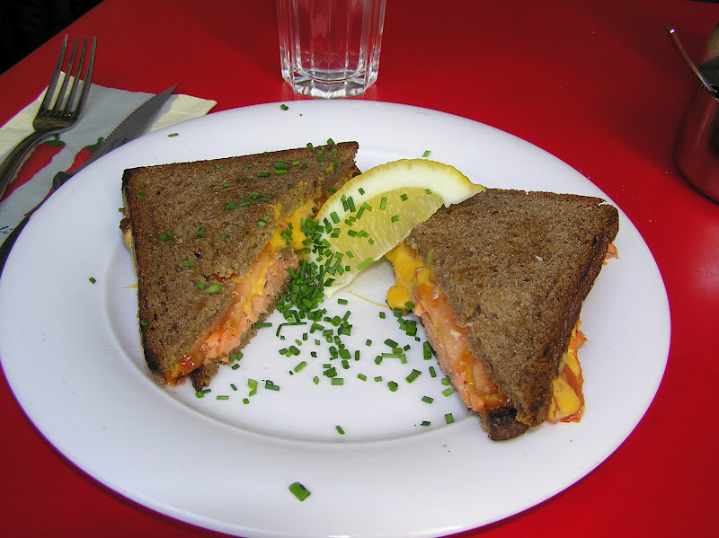 Mi menú: Sandwich de salmón con queso cheedar y pan negro esponjoso, agua con sabor a lima (me gusta esa idea nórdica de mezclar el agua con rodajas de fruta) y un café latte (en vaso gigante, por supuesto).